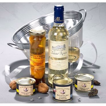 Coffret Marmiton nacré - Marmiton en métal nacré - Un Bloc de Foie Gras de Canard du Périgord (IGP Périgord) de 100g - Une Terrine de Canard aux Morilles de 65g - Une Terrine du Quercy aux Noix de 65g - Un Quatuor de Fruits rafraîchis à la Vieille Prune "Louis Roque" de Souillac Bocal de 200 ml - Une Demi-bouteille de Côtes de Bergerac Blanc Moelleux "Château Ramon" de 37,5 cl