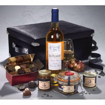 Coffret prestige VIP - Boîte prestige velours noir - Un Bocal de Foie Gras de Canard Entier du Périgord (IGP Périgord) de 130g - Un Médaillon de Magret de Canard au Foie de Canard (avec 20 % de foie gras) de 100G - Un Bocal de Chutney d'Abricot façon Pain d'Epices de 115g - Un Ballotin de Chocolats assortis artisan français "l'Invitation Gourmande" de 200g - Une Bouteille de Sainte-Croix-du-Mont "Château des Palmiers" de 75 cl