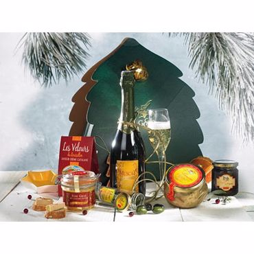 Coffret Sapin des cimes. Un Sapin en carton vert contenant : - Un Pétillant de Muscat - bouteille 75 cl, - Un Foie gras entier de canard au Muscat de Rivesaltes - 180 g, - Un Braisé d?Oie à la crème de Figues - 300 g, - Un Bocal de « Choc Olives » (amandes grillées enrobées de chocolats) - 100 g, - Un Ballotin de « Velours du Roussillon » à la crème catalane - 80 g, - Une Coupelle apéritif « Étoile » en céramique.