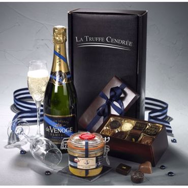 Coffret Trilogy - Coffret noir et argent "La Truffe Cendrée" - Un Bocal de Foie Gras de Canard Entier du Périgord (IGP Périgord) de 180g - Une Boîte de Chocolats Prestige assortis artisan français "l'Invitation Gourmande" de 250g - Une Bouteille de Champagne Brut Sélection Cordon Bleu "de Venoge" de 75 cl Guide Hachette des Vins