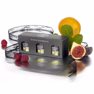 Coffret trois confitures : Présenté dans un étui noir : -Confiture d'Orange BIO - 30 gr -Confiture de Figue BIO - 30 gr -Confiture de Framboise BIO - 30 gr