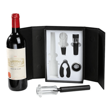 Coffret vin 5 pièces comprenant un tire-bouchon à pression d'air, un col à bouteille, un bec verseur, un coupe-capsule et un bouchon vide d'air, livré sans bouteille
