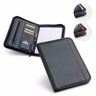 Conférencier A4. Simili cuir. Calculatrice dual-power à 8 chiffres. Pile LR1130 incluse. Bloc-notes: 20 feuilles lignées. Stylo à bille non inclus.Coffret cadeau: 175 x 41 x 20 mm