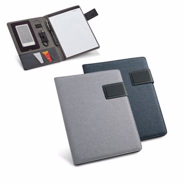 Conférencier A5. Imitation lin et simili cuir. Fermeture aimantée. Bloc: 20 feuilles lignées. Plaque métal avec finition gomme. Stylo à bille et accessoires non inclus. 183 x 252 x 18 mm | Plaque métallique: 50 x 30 mm