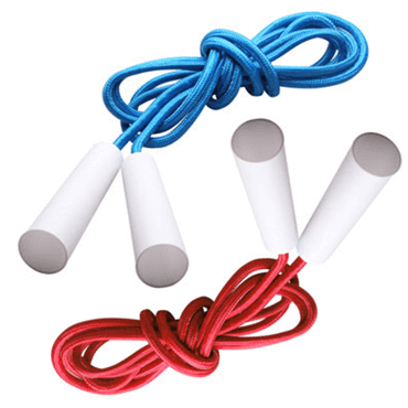 C'est si facile de rester en forme. Corde à sauter composée d'un mélange de matières, à savoir de polyester, Non-Woven et caoutchouc avec 2 poignées blanches en PP. La corde est disponible en bleu et rouge.