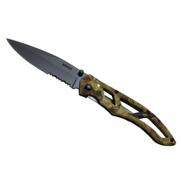 Couteau pliant avec lame en acier inoxydable 420 semi dentée, revêtement titane. Ouverture et fermeture une main pour gaucher et droitier. Cran de sécurité de type liner lock. Longueur utile de la lame : 9 cm. Manche en acier inoxydable avec revêtement camouflage touché gomme. Clip de ceinture.