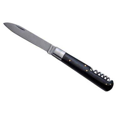 Couteau pliant avec lame en acier inoxydable 420. Longueur utile de la lame : 10 cm. Manche en acier inoxydable et stamina noir. Une mitre forgée en acier inoxydable. Tire-bouchon 5 spirales en acier inoxydable. Guillochage traditionnel.
