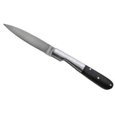 Lame en acier inoxydable, manche en bois massif de couleur marron fonçé.