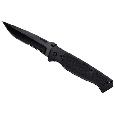 Couteau pliant avec lame noire en acier inoxydable 420. Ouverture et fermeture une main pour gaucher et droitier. Cran de sécurité de type liner lock. Longueur utile de la lame : 9 cm. Manche en acier inoxydable, ABS avec insert caoutchouc. Passant pour corde à l'arrière du manche. Clip de ceinture.
