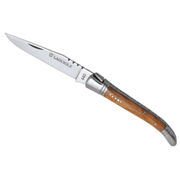 Ce couteau Laguiole pliant est réalisé d'après un cahier des charges très strict : Une lame en acier 440 : l'acier 440, dit "acier chirurgical", est un acier inoxydable. C'est le parfait compromis entre le chrome (qui protège de la rouille) et le carbone (qui garantit le tranchant). Les lames de nos Laguioles sont affûtées "rasoir". Sous réserve d'une utilisation normale du produit, la qualité de l'acier garantit un parfait tranchant pendant plusieurs mois. Longueur de lame utile : 9,5 cm. Deux mitres en acier inoxydable forgées : il s'agit des pièces en métal de part et d'autre du manche. Elles garantissent la solidité de l'assemblage du couteau et renforcent son esthétique. Les mitres de nos Laguioles sont forgées (pleines). Le manche : le bois d'olivier est un bois très nervuré qui confère un caractère d'authenticité et de terroir à ce grand classique de la coutellerie. Ce modèle est en outre orné d'un motif représentant la croix du berger. Note : afin de vous proposer ces produits au meilleur prix, nos Laguioles sont produits à l'étranger. Voir à ce sujet notre article : Vrai ou faux Laguiole ? un vrai débat.