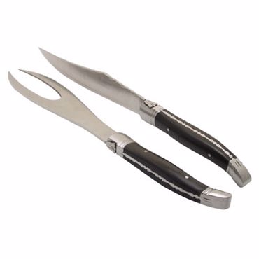 Set composé d'un couteau Laguiole à découper et d'une fourchette de service. Lame et fourchette en acier inoxydable 420 à usage alimentaire (acier martensitique conforme à la norme EN10088-2 2005). Manche en stamina noir, deux mitres forgées. Livré dans un écrin en carton de couleur noir. Avertissement : ce produit n'est pas compatible pour un usage au lave vaisselle.