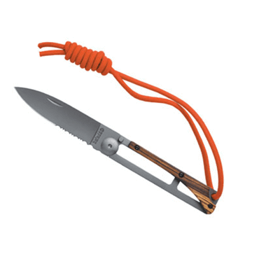 Couteau pliant en acier inoxydable 420, Lame et manche avec revêtement titane gris anthracite. Lame semi dentée avec cran de sécurité de type "liner lock". Manche en frêne exotique. Longueur utile de la lame 7,5 cm. Livré avec paracorde orange.
