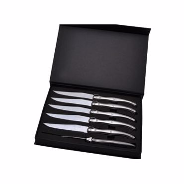 Couteaux de table Laguiole. Set de 6 Laguiole de table en acier inoxydable 420 à usage alimentaire (acier martensitique conforme à la norme EN10088-2 2005). Lame microdentée. Compatible lave-vaisselle. Livrés dans un luxueux coffret en carton noir.