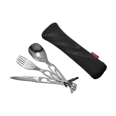 Ensemble de 3 couverts en acier inoxydable alimentaire présenté dans une housse néoprène de couleur grise anthracite. 5 fonctions : couteau, cuillère, fourchette, ouvre boite, décapsuleur. Attache avec un mousqueton en aluminium.