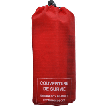 Couverture de survie en aluminium résistant. 1 surface argentée / 1 surface dorée. Surface argentée à l'extérieur : renvoie les rayons calorifiques et isole de la chaleur (climatisation efficace d'une tente, d'une caravane ou d'une voiture). Surface dorée à l'extérieur : isole de l'humidité, du froid et de la pluie (en cas d'accident, permet de conserver la température du corps). Livré dans une housse en nylon résistant de couleur rouge.