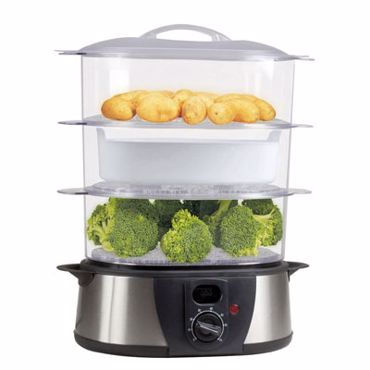 Cuiseur vapeur 3 étages, capacité 12 L, fonction vapeur rapide, timer 60 minutes avec arrêt automatique, témoin de fonctionnement, indicateur niveau d'eau.
