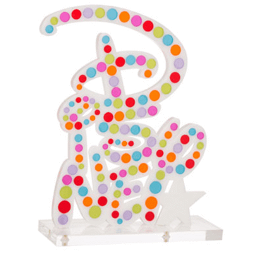 Trophée lettrage en altuglas sur mesure de 200 mm de hauteur totale en PMMA incolore épaisseur 8 mm + PMMA blanc opaque en 3 mm creusé pour incruster des confettis de toutes les couleurs découpés au laser socle en PMMA translucide de 160 x 60 x 10 mm d'épaisseur Emballage : papier de soie, et bulle, dans un carton collectif blanc. Possibilité d'un écrin sur mesure couleurs intérieure et extérieure ou choix. Personnalisable par une plaquette métalex