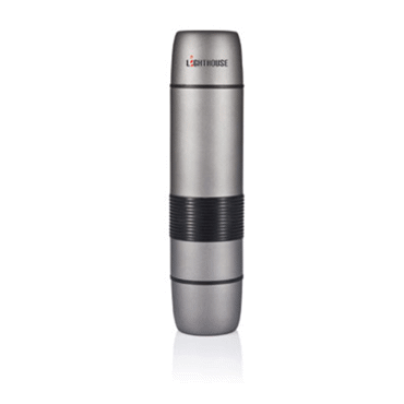 Bouteille 850ml en acier inoxydable, double parois vide d?air, détails noirs, 2 mugs intégrés et 2 compartiments séparés de 600ml et 250ml.
