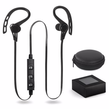 Écouteurs. ABS. Avec transmission bluetooth. Autonomie jusqu'à 4 h. Fonction pour décrocher appels, contrôle du volume et connexion aux playlists des dispositifs mobiles. Inclus câble USB/micro-USB. Livrés dans housse en EVA, avec coffret cadeau. Housse: ø85 x 35 mm | Coffret: 90 x 90 x 40 mm