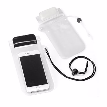 Étui pour téléphone portable en PVC imperméable avec bande ajustable. La partie avant est transparente et le devant est blanc mat. L'étui a une fermeture hermétique et un rabat de couleur avec fermeture velcro. 240 x 95 mm