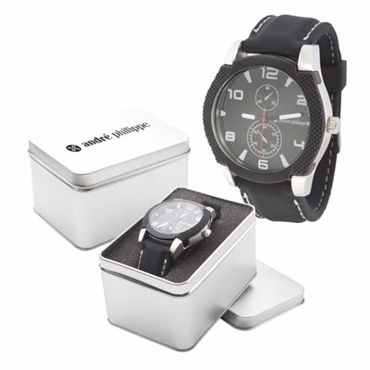 Elégante montre pour homme en métal avec bracelet en silicone, dans une boîte de cadeau en métal. Produit de la marque André Philippe.
