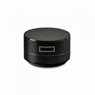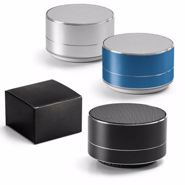Enceinte avec micro. Aluminium. Avec transmission bluetooth et lecteur de cartes TF. Avec 3W/4O. Autonomie jusqu'à 5 h. Fonction pour décrocher appels, contrôle du volume, connexion aux playlists des dispositifs mobiles et radio FM. Inclus câble USB pour chargement. Livré dans coffret cadeau.