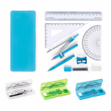 Ensemble de géométrie. Coffret en PP avec 9 pièces: 1 compas, 1 gomme, 1 taille-crayon, 1 crayon de papier, 1 porte-mine 0'5, 10 mines, 1 règle, 1 équerre et 1 raporteur. 165 x 68 x 25 mm Sachet individuel, PP box
