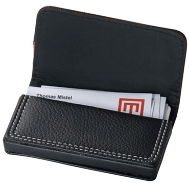 Elégant étui à cartes de visite avec des accessoires particuliers : fin cuir imité, plaque en acier inoxydable pour la gravure, fermeture magnétique, fine double couture claire, fibre synthétique.