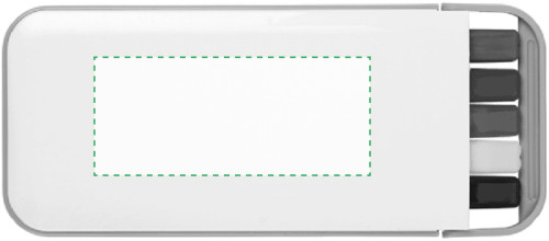 Etui en plastique contenant 3 stylos bille (mines noire, bleue et rouge), un surligneur jaune et un porte-mine.