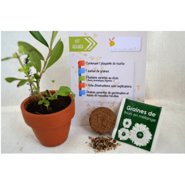 Fiche Herbier ludique: Le destinataire dispose de tous les éléments pour réaliser son kit de plantation à partir d'un contenant de son choix chez lui ( petit pot, pot alimentaire de récupération ...) contenant 1 plaquette de tourbe de 38 mm de diamètre 1 sachet de graines 51x50 mm standard Plusieurs variétés au choix ( fleurs, aromatiques, légumes ...) 1 fiche d'instructions avec explications au format 90x120 mm fiche personnalisée en quadri recto-verso avec vore communication ensemble livré sous film transparant
