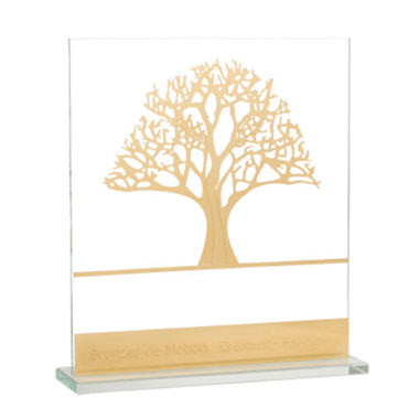 Trophée Arbre en découpe laiton 1 mm sur une plaque altuglas de 200 x 180 mm en 8 mm d'épaisseur sur socle altuglas de 125 x 45 mm en 10 mm d'épaisseur, possibilité de fixer sur un trophée en verre Plaque laiton gravée ép. 1 mm pour cacher les fixations. Possibilité finition : argent / nickelage / bronze Emballage : papier de soie, et bulle, dans un carton collectif blanc. Possibilité d'un écrin sur mesure couleurs intérieure et extérieure ou choix. personnalisable par une plaquette métalex