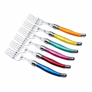 6 fourchettes Laguiole coffret bois. Les fourchettes sont en acier inox, manche de couleur nacrée: rose, jaune, rouge, orange, bleu et vert