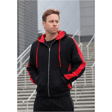 80% coton / 20% polyester. Bandes contrastées le long de la manche. Capuche intérieure contrastée. Poche kangourou.