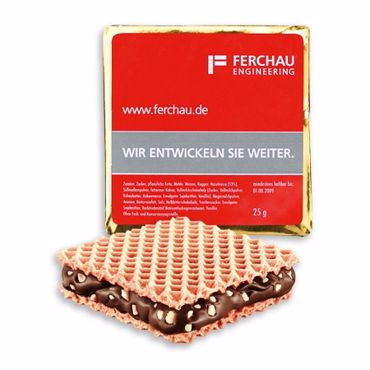 Gaufrette aux noisettes hanuta, présentation usuelle, carrée, enveloppée dans du papier doré, dotée sur une face de létiquette hanuta traditionnelle