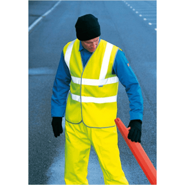 100% polyester tricoté. BS EN471: 1994 Classe 2.Deux bandes haute visibilité de 5cm sur le corps et une sur chaque épaule. Fermeture velcro®.