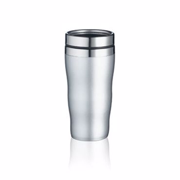 Gobelet Wave. Gobelet 400ml, extérieur en ABS, intérieur en PP, anneau en acier inoxydable et couvercle à clapet.. Couleur : argenté, gris, bleu.