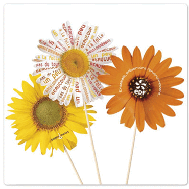 Fleur personnalisée Présentation : ""Fleur coupée"" ludique et originale, cette attention offre la possibilité de faire pousser de vraies fleurs. Un sachet de graines est inséré au coeur de la fleur. Logistiquement très intéressante (plus de contraintes de transport/stockage). Composition : 1 sachet standard de graines communes (marguerite, tournesol - autre, nous consulter). Envisageable avec des graines bio (Semences issues de l’Agriculture Biologique, certifiées par FR-BIO-01). Longueur : 120 mm. Largeur : 120 mm. Hauteur : 300 mm. Poids : Environ 10 gr. Personnalisation : Impression en quadrichromie sur toute la surface visible à votre communication. Quantite minimum : 500ex. Prix indiqué hors frais techniques et frais de transport