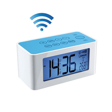 Haut-parleur universel, radio réveil FM, ne nécessite aucune connexion (poser la source audio sur la partie supérieure), double alarme, réveil par sons de la nature ou par radio, affichage LCD avec rétro-éclairage bleu, affichage de la température, câble USB inclus