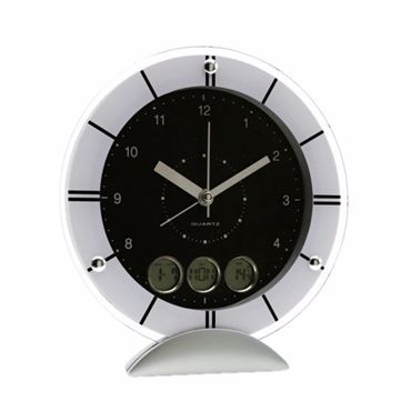 Horloge "Meteora" : avec affichage analogue, affichage digital de la date, calendrier, thermomètre dans 3 trois écrans ronds, pied argenté