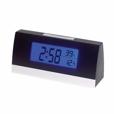 Horloge de table "Nice day" : avec thermo - et hygromètre, rétroéclairage bleu et bande aluminium pour gravure