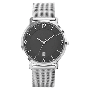 Boîtier acier brillant Ø 39 mm Bracelet cuir noir Bracelet milanais Cadran anthracite ou noir avec index Mouvement Citizen GM 10 avec dateur à 6h Dimensions de marquage : Ø 24 mm Écrin luxe