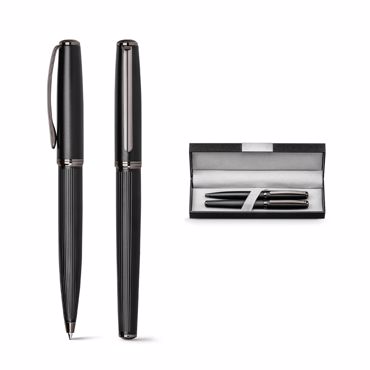 Set de stylo à bille en métal et roller fournis dans un élégant coffret rembourré. Fourreau noir, Stylo sous polybag, Coffret cadeau, Roller sous polybag
