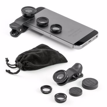 Jeux de mini lentilles universelles. ABS et aluminium. idéal pour smartphones et tablettes. 3 en 1. Inclus: 1 clip, 1 lentille macro (10x), 1 lentille angulaire (0.67x), 1 lentille fiheye (180º), 2 bouchons d'objectif et pochette en velours. Livré en boîte. 137 x 95 x 25 mm