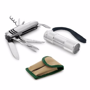 Kit aventure. Acier inox, métal et aluminium. Avec canif multifonctions (11 fonctions) et lanterne (3 piles AAA incluses). Livré sous pochette en 600D. Housse: 84 x 120 x 25 mm
