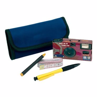 Kit en cas d´accident comprenant appareil photo, crayon de cire, mètre ruban, crayon et feuilles de rapport d´accident dans un étui