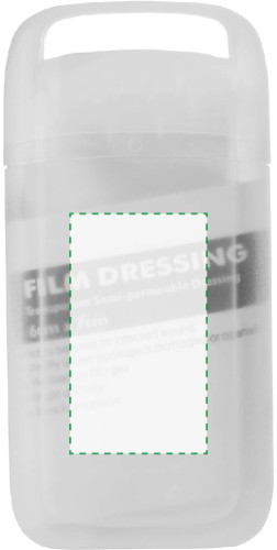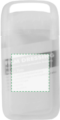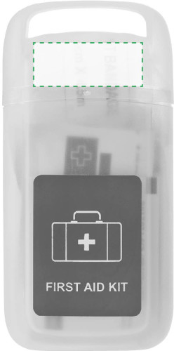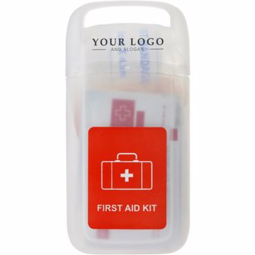 Kit de premiers secours en PP dans un étui transparent comprenant pansement, bande et lingettes stériles, compresse, lingette antiseptique et une paire de ciseaux.