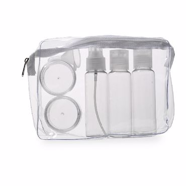 Kit de voyage 'Aéroport' comprenant 5 flacons vides dans une trousse transparente zippée.