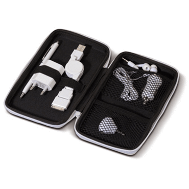 Kit de voyage (matériau: EVA) avec écouteurs, chargeur USB de voiture (700mA), stylo bille/stylet métallique, câble de connection USB universel (connecteurs: micro USB, Apple 30pin et lumière), fiche USB 220V (1000mA) et support/séparateur smartphone. Toujours utile pendant les voyages. Ceci est un cadeau finctionnel et précieux.