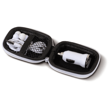 Kit compact de voyage (EVA-matériau) incluant un chargeur de voiture USB (700mA) et des écouteurs. Toujours utile pour vos voyages.