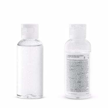Gel hydroalcoolique en flacon PET de 50 ml avec couvercle rabattable. Formule chimique avec 68% d'alcool. C'est un produit cosmétique. Pratique à emporter et à utiliser n'importe où. Mentions légales disponibles en: [PT | EN | ES | FR | IT | DE | CZ | SK] ø35 x 100 mm